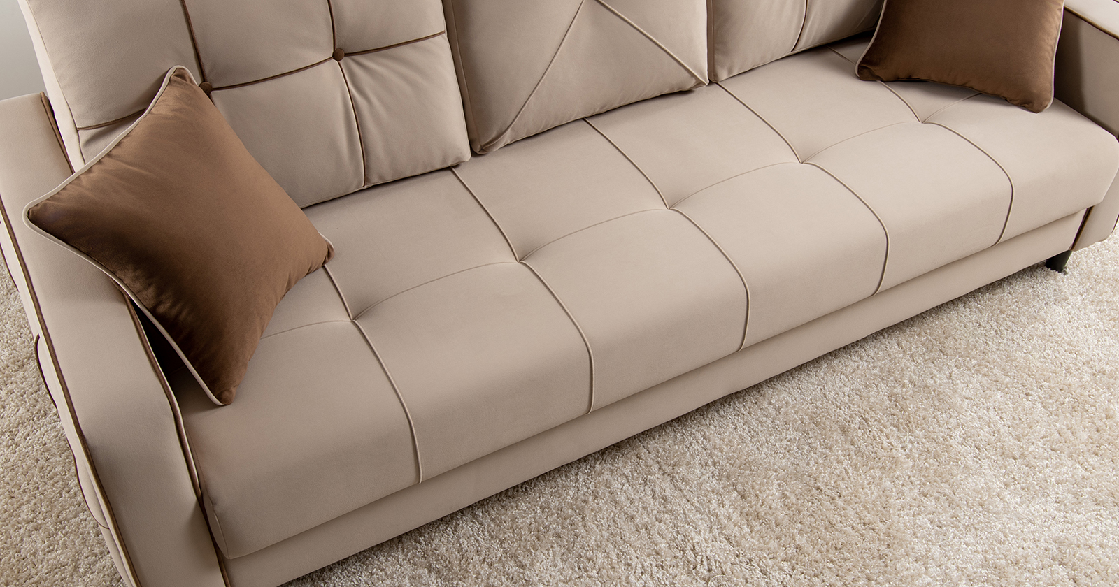 Декоративные канты на подушках и вставке подлокотников. Пуговицы в местах пересечения кантов на подушке и вставке подлокотников. По торцам подлокотников и думках контрастный декоративный кант. Защипы на сиденье и средней большой подушке.
