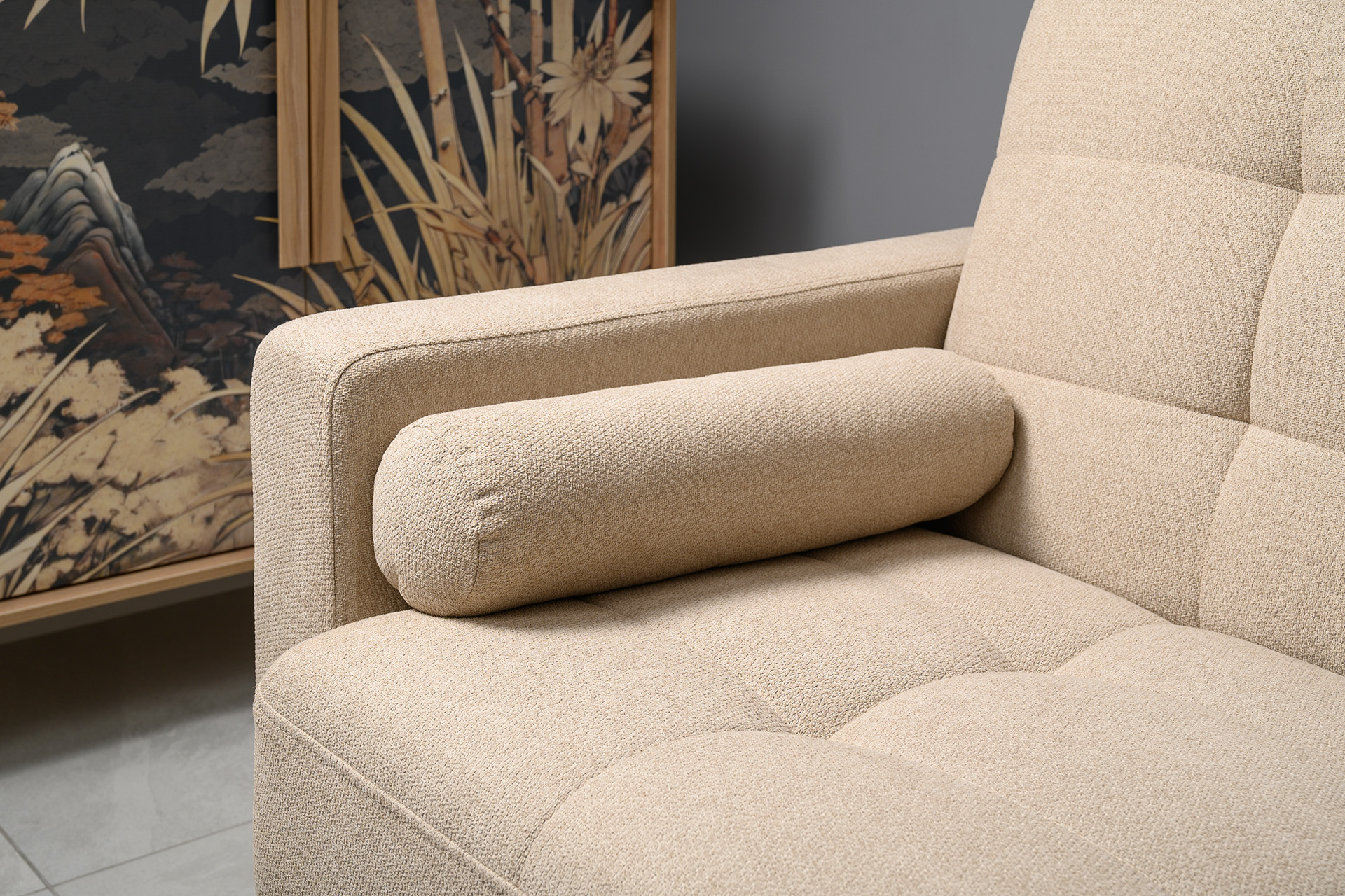 Прямоугольная стежка по спинке, посадочному месту и подлокотниках, круглые подушки-валики