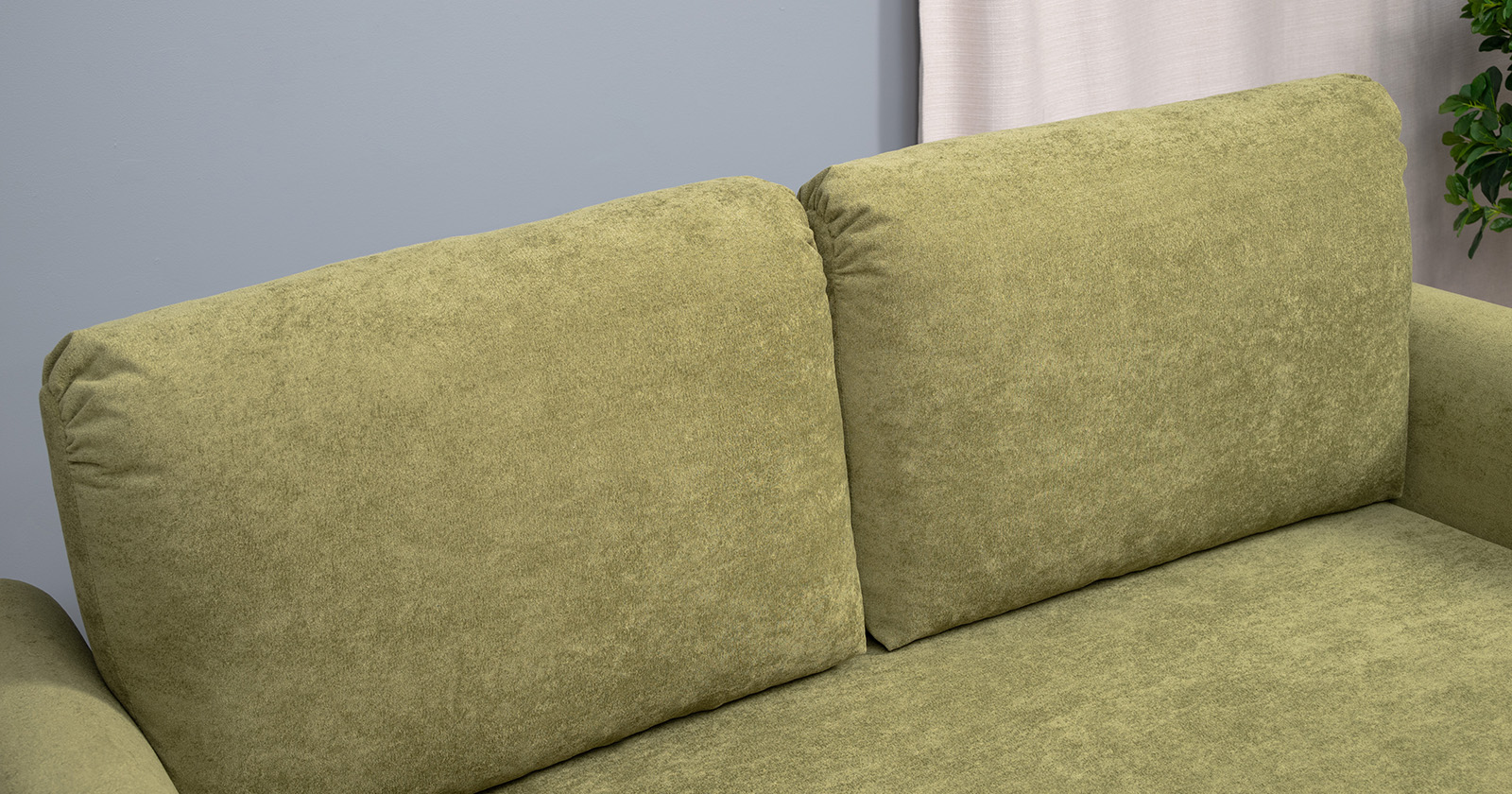 Декоративные утяжки и складки на подлокотниках придают дивану неповторимый шарм, который станет изюминкой любого интерьера — от классического до современного. Приспинные подушки со сборкой в верхней части.