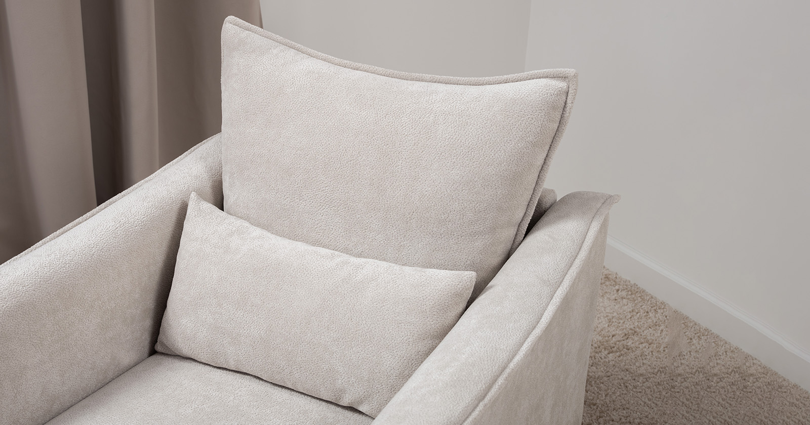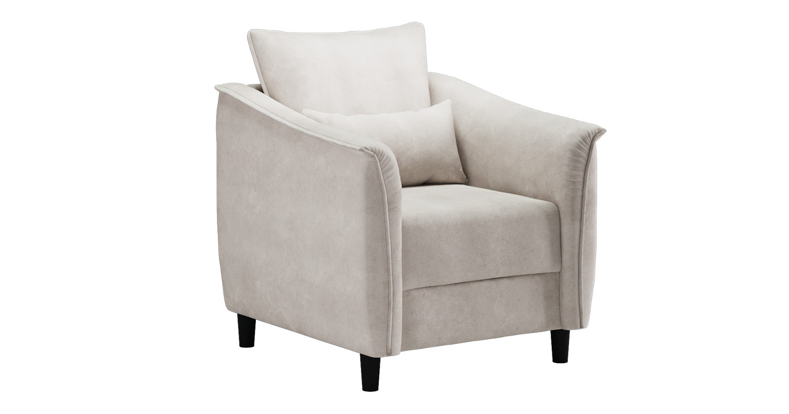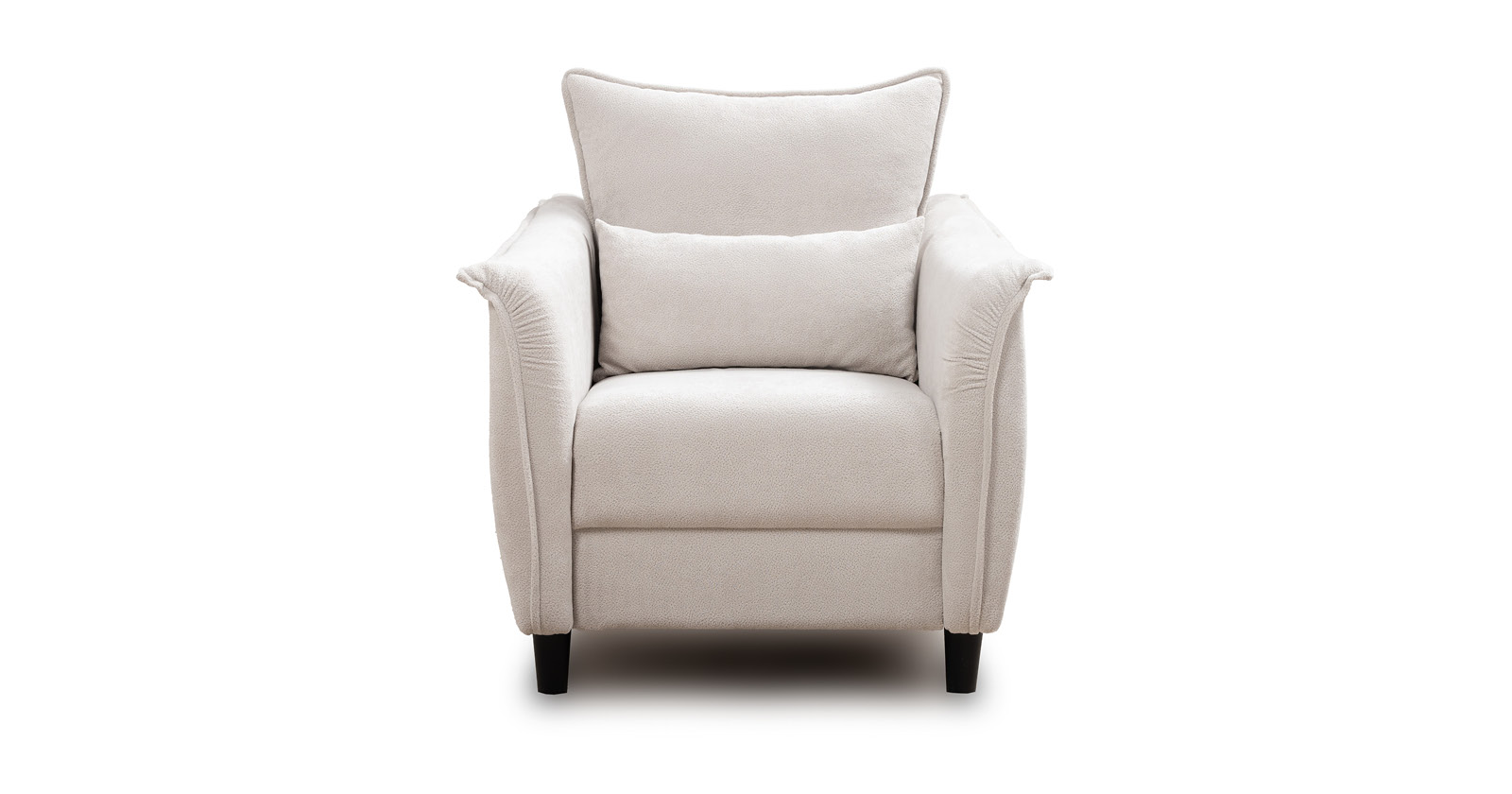 Кресло с приспинной подушкой трапецивидной формы на молнии, по трем сторонам которой проложена отделочная строчка на 1,2 см. По контуру боковин проложен декоративный кант на 1,2 см основной ткани. Кант проходит по центру передней части боковины, а по внутренней верхней части сборка.