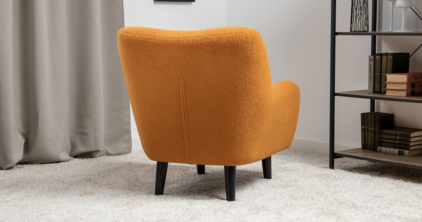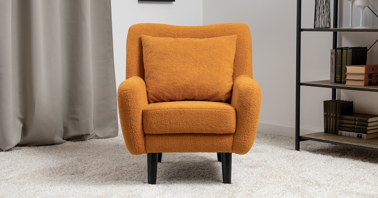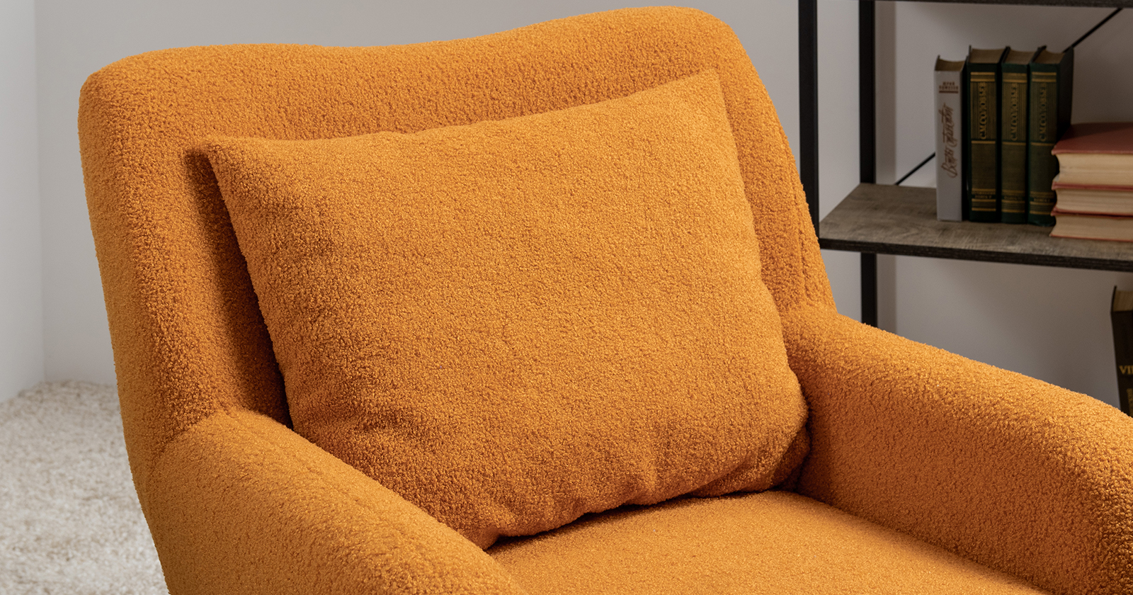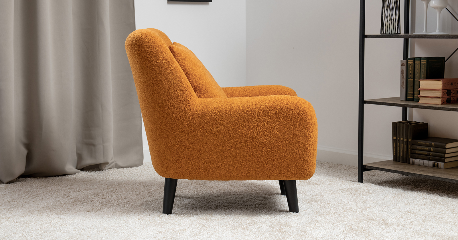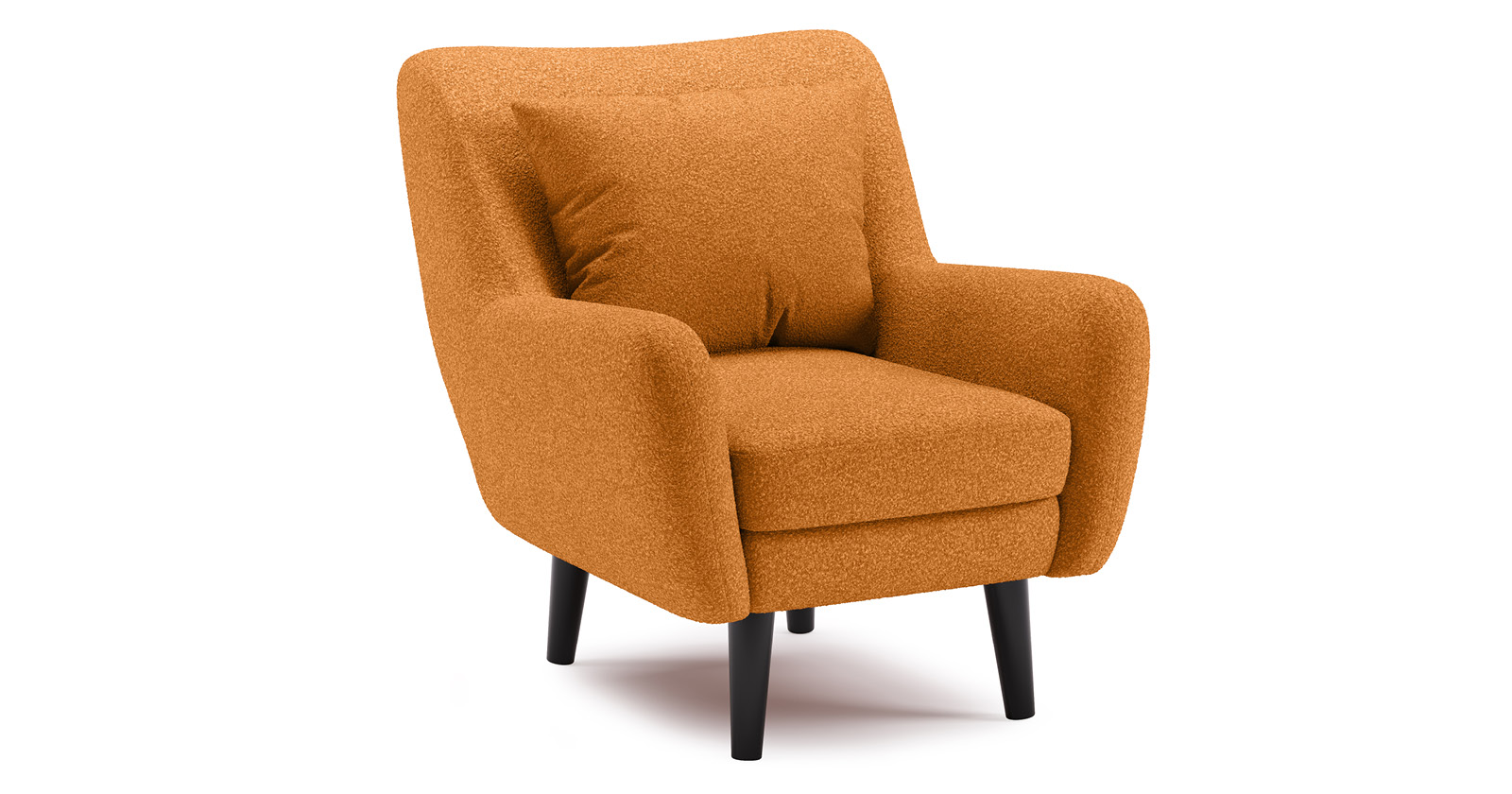 Ткань букле делает кресло особенно уютным и мягким. Приспинная подушка в цвете кресла