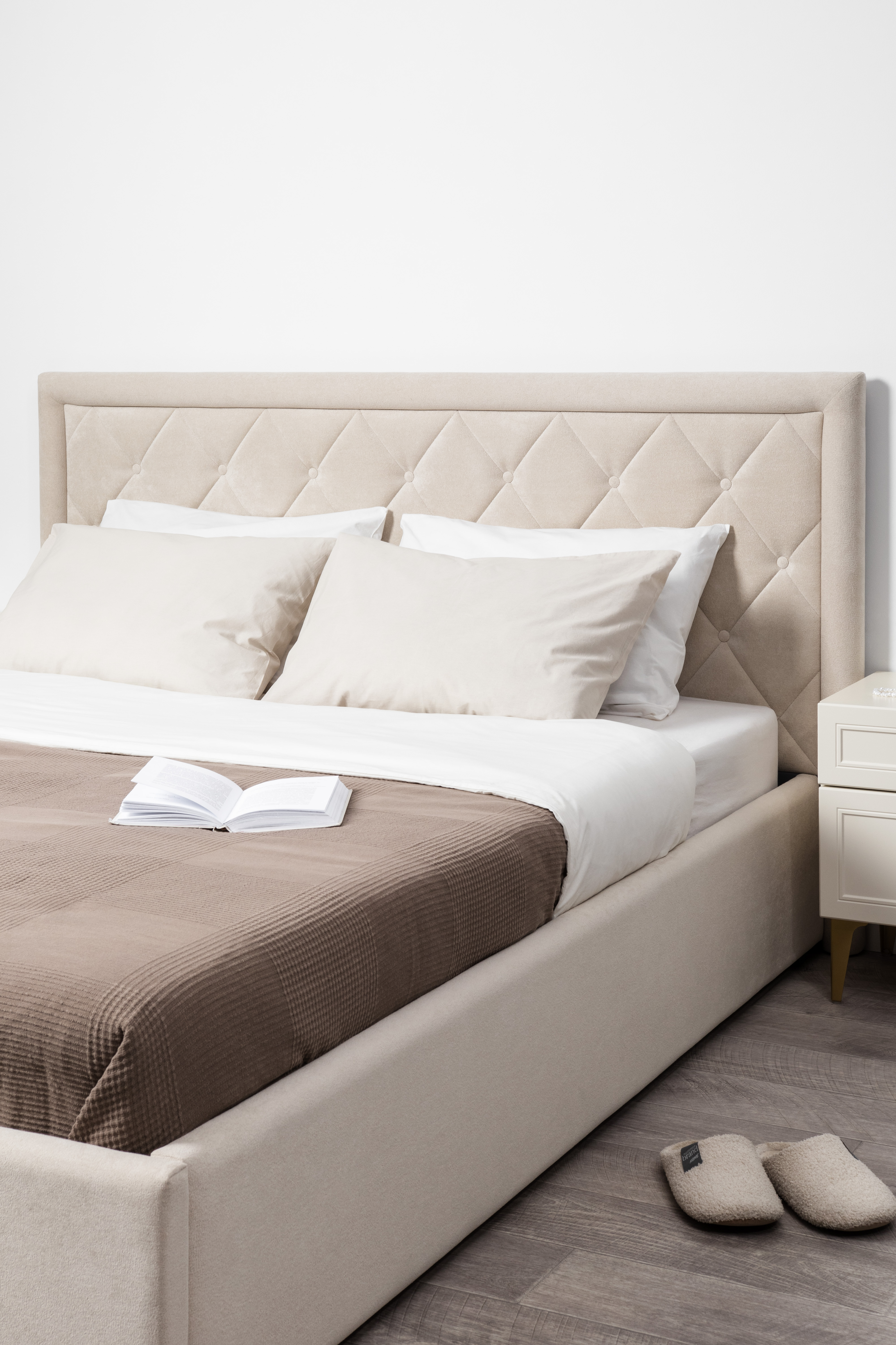 Кровать Марион — это идеальное сочетание стиля и комфорта. Элегантное изголовье оформлено стежкой в виде классической каретной стяжки, украшенной декоративными пуговицами, что придаёт изделию выразительный и утончённый вид. По всему периметру кровати проходит аккуратный валик, подчеркивающий геометрию и завершённость формы.