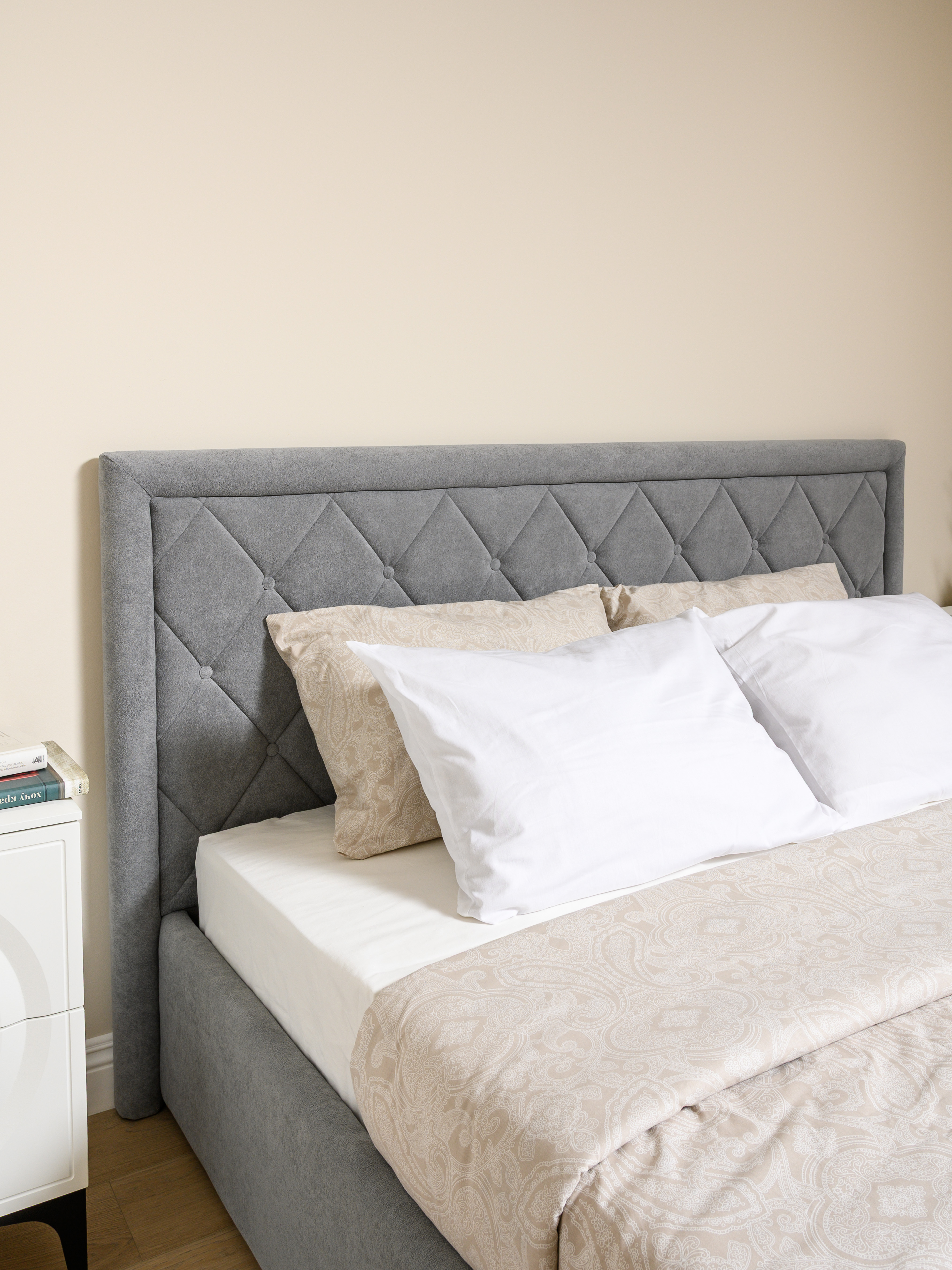 Кровать Марион — это идеальное сочетание стиля и комфорта. Элегантное изголовье оформлено стежкой в виде классической каретной стяжки, украшенной декоративными пуговицами, что придаёт изделию выразительный и утончённый вид. По всему периметру кровати проходит аккуратный валик, подчеркивающий геометрию и завершённость формы.