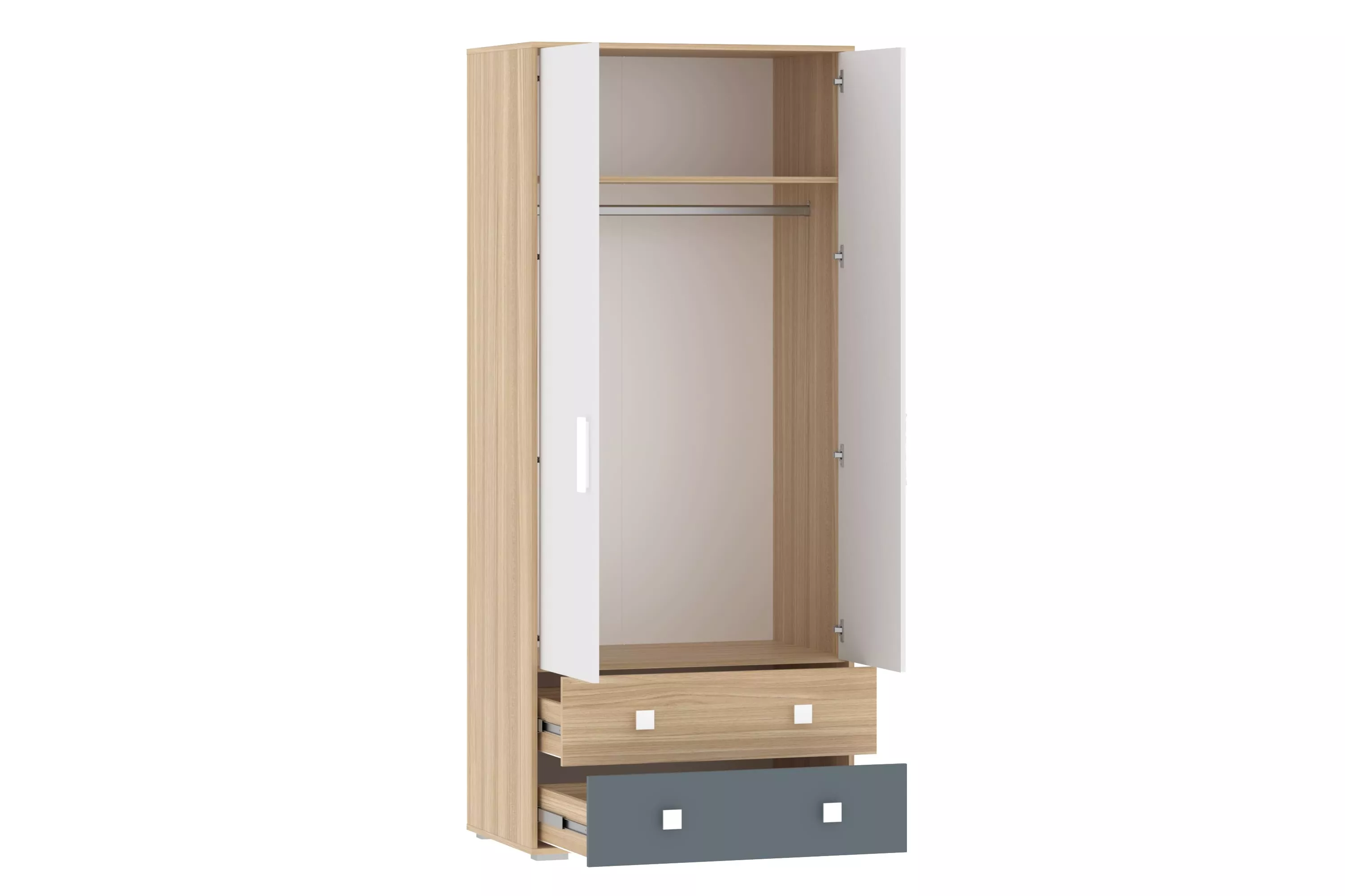 Внутри двустворчатого шкафа предусмотрена овальная штанга для одежды на вешалках, а также шкаф оснащен двумя выдвижными ящиками. Комбинируйте шкаф для одежды и одноименные модульные шкаф-пеналы или стеллаж, чтобы создать системы хранения на любой вкус и размер!