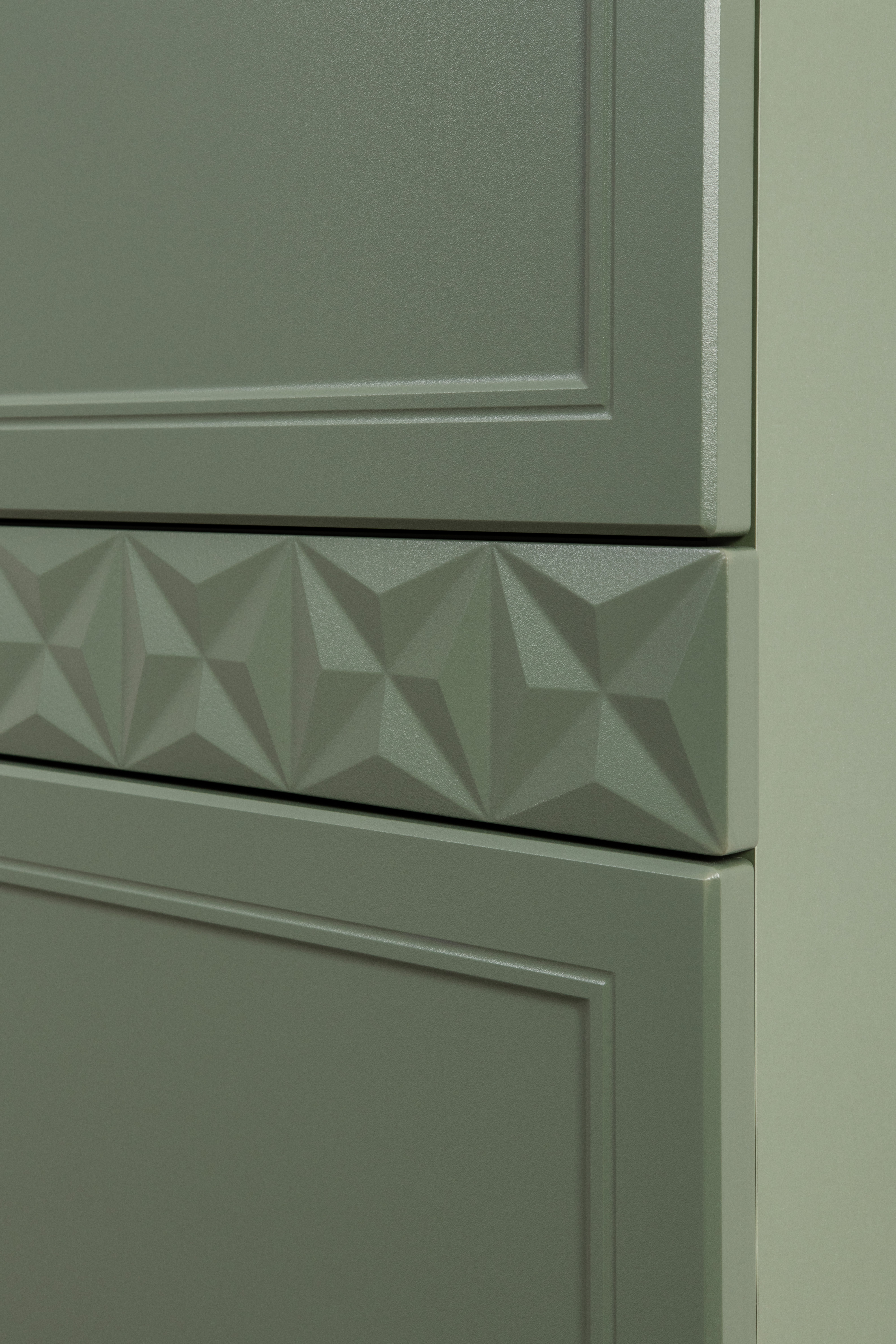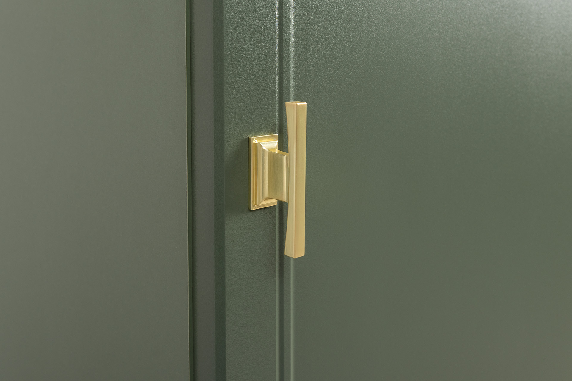 Изящные линии, глубокая фрезеровка фасадов из МДФ и благородные оттенки. Утончённая «Слоновая кость» и изысканная «Олива Шагрень» с глубоким зелёным тоном — создают атмосферу уюта, тепла и благородства. Металлические ручки и опоры золотого цвета придают мебели утончённый блеск, а петли и направляющие с доводчиками обеспечивают плавное и бесшумное закрытие фасадов.