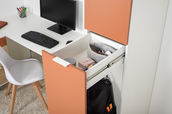 Все вещи ребёнка будут на своём месте. На столе есть крепление для рюкзака или наушников. Наполнение шкафов для одежды можно менять на выбор: полки либо штанги. Петли фасадов оснащены доводчиками.
